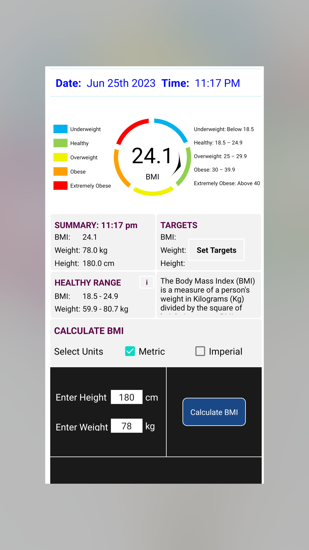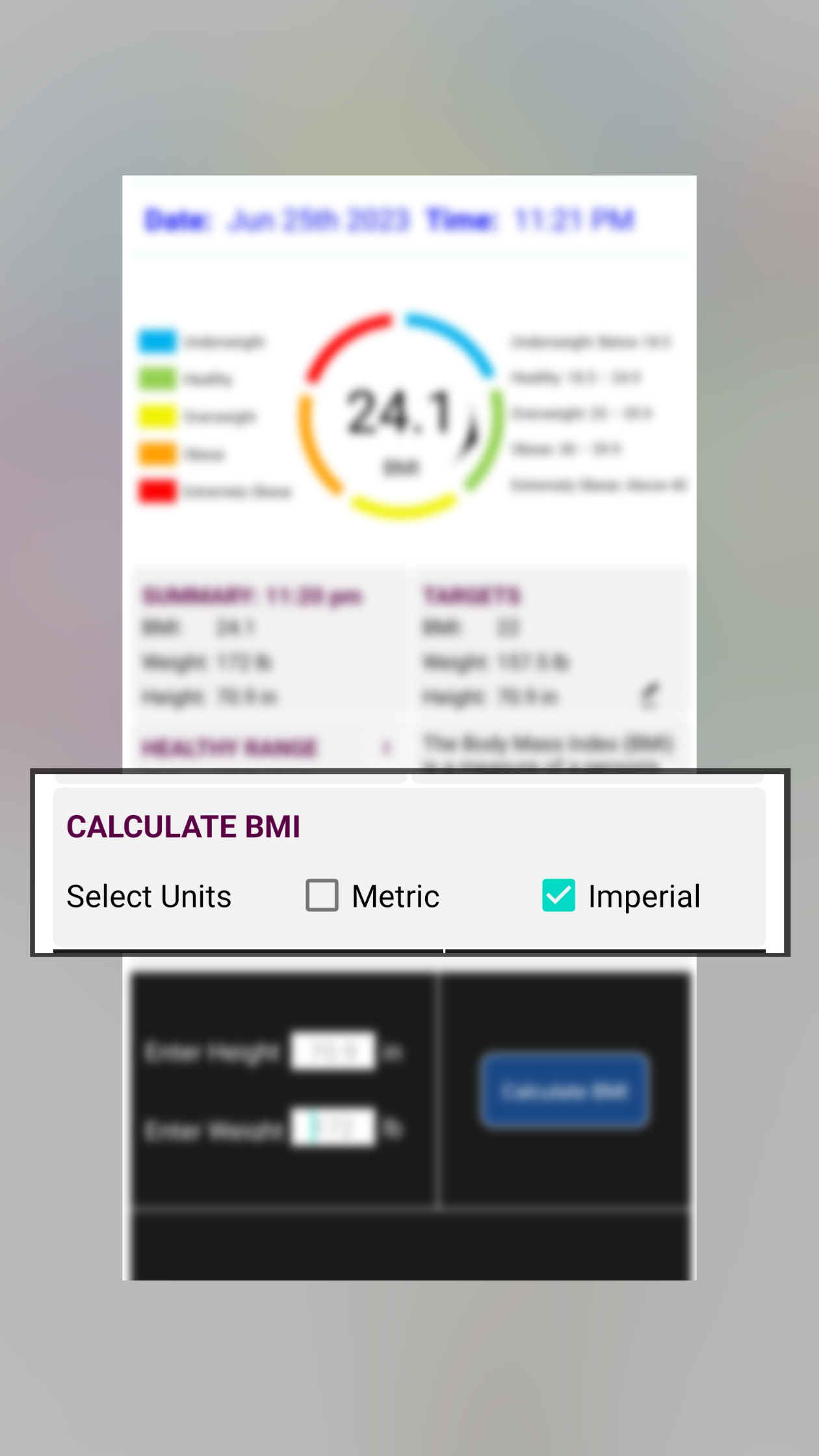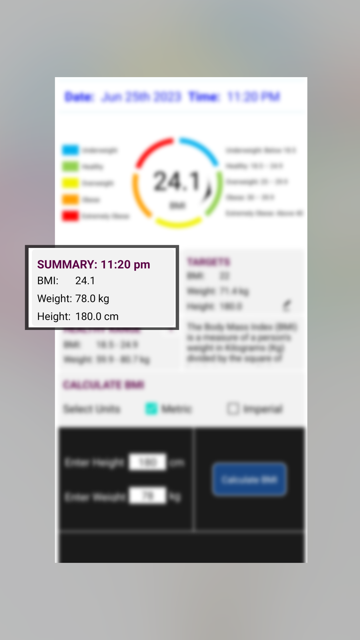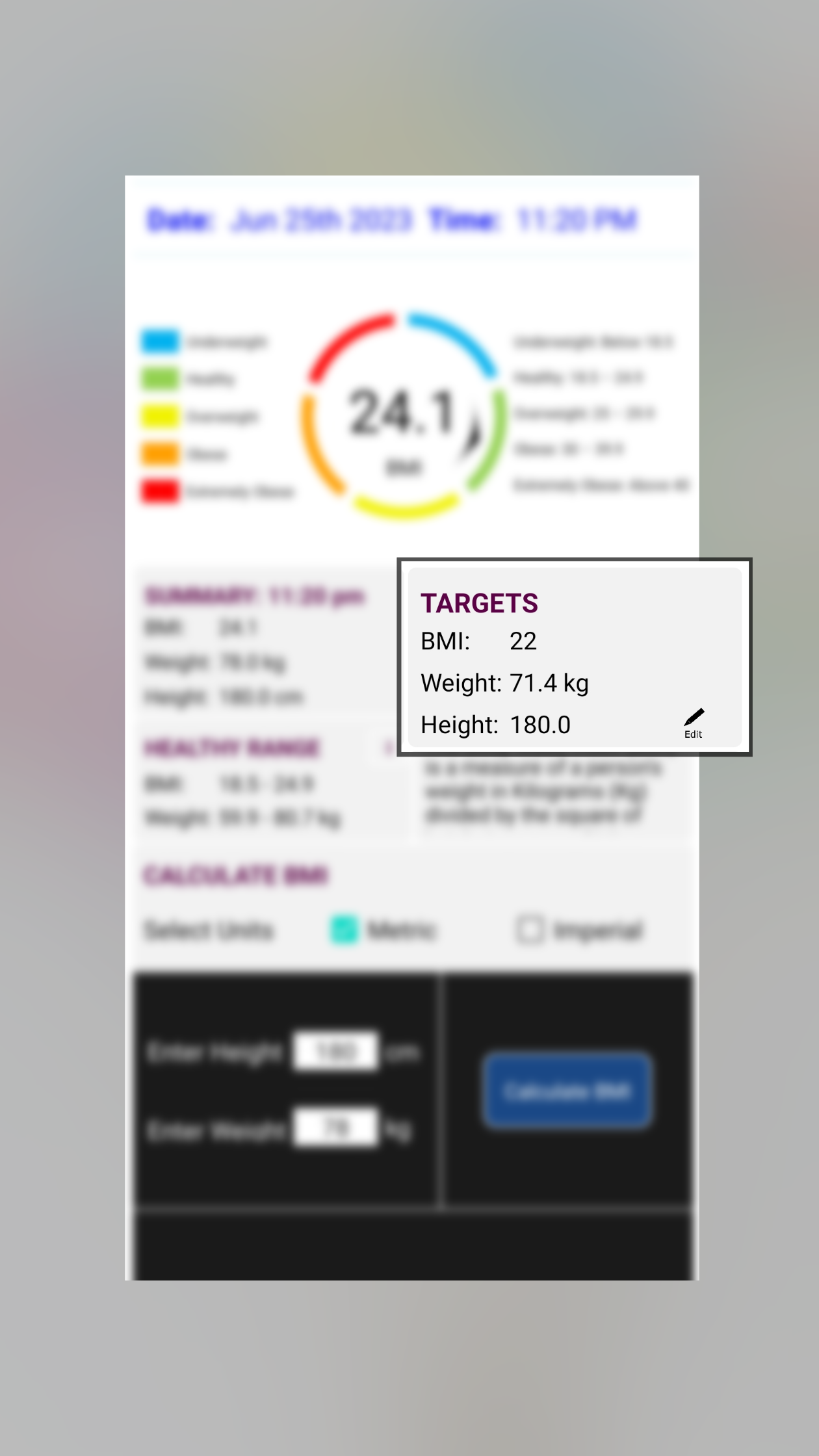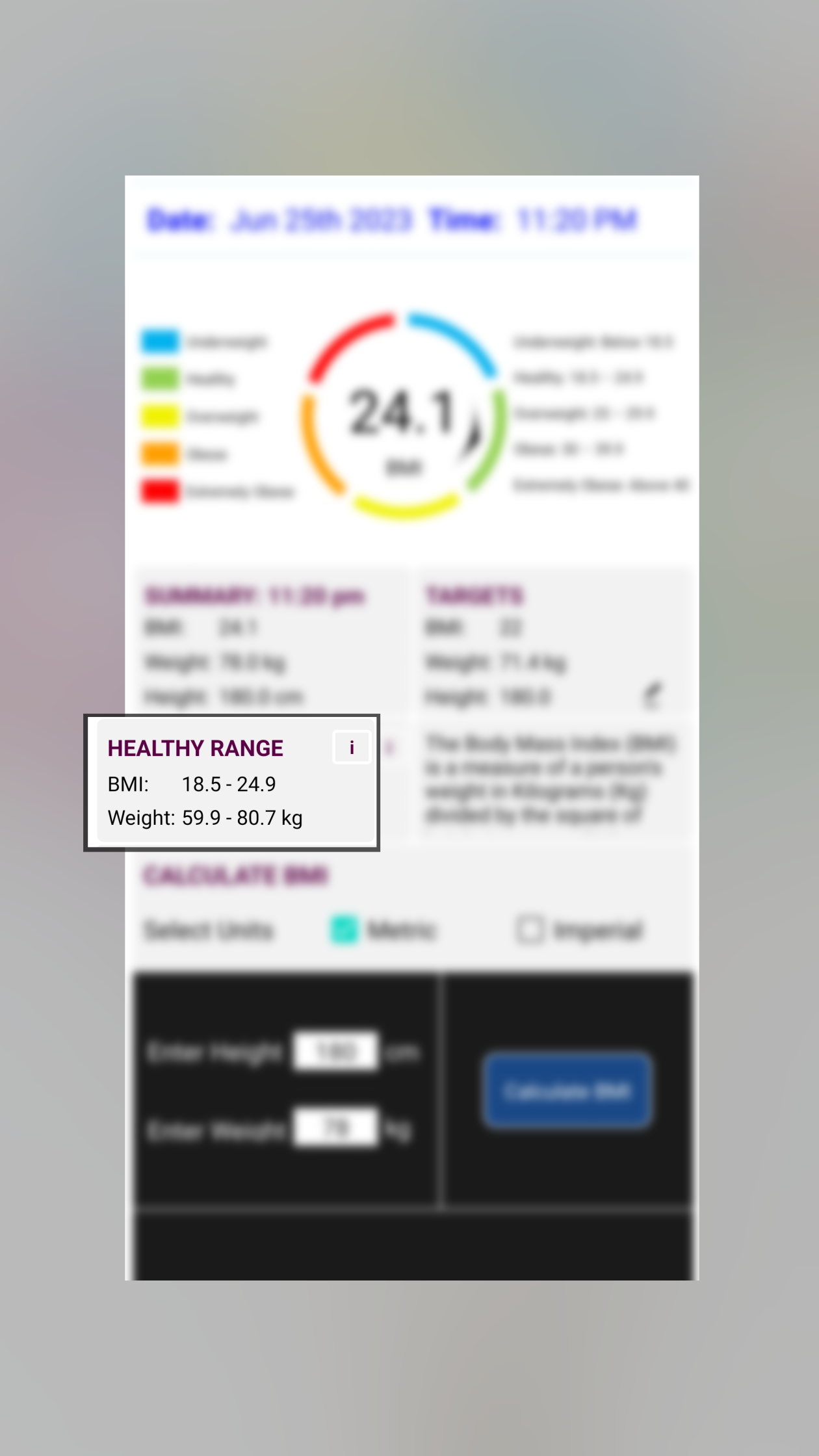 Calculate BMI in a simple steps, Insert Weight, Height and calculate your BMI. BMI calculated in metric or imperial units. Saved history from your previous calculation.BMI Healthy range indicator for your height.