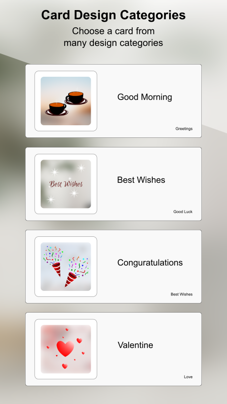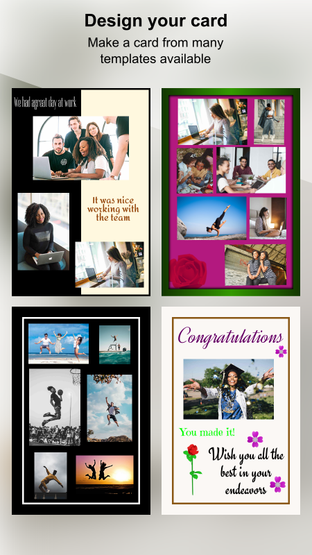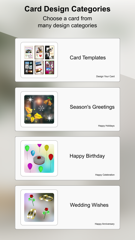 Photo Cards Pro: Amazing card designs, many template designs. Choose between Greeting Cards, eCards, Wishing Cards, Season's Greetings, Card Templates to Personalize Your Cards.